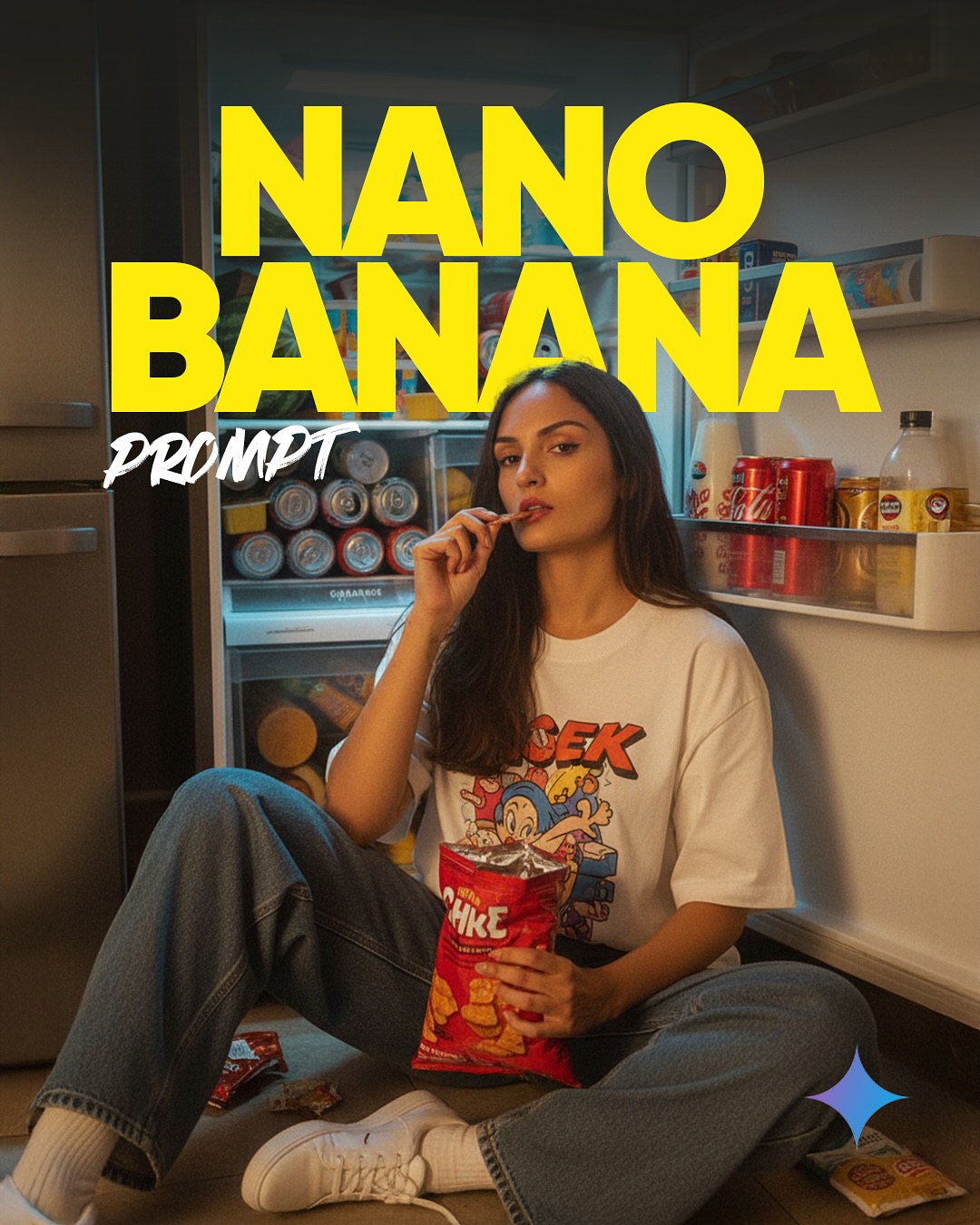 Don't change my face and my hairstyle. Person sitting on the floor in front of an open messy fridge, leaning slightly back with relaxed posture, legs open in a casual spread, confident body language, one hand holding a snack near the mouth, the other hand resting on lap with snack bag. Face showing arrogant Fashion model expression, sharp gaze, lips slightly parted, candid indie aesthetic.Wearing oversized y2k white shirt with toon illustration, oversize jeans. Chill pose, a red snack bag on lap and a piece of snack near the mouth. Fridge interior filled with messy food and drinks (watermelon, yogurt cups, milk cartons, soda cans, cheese packs, colorful boxes). Bright fridge light casting cool bluish tone, contrasting with warm red pants and snack bag. Candid indie photography style, cinematic RAW, high resolution, soft grain, artsy skena vibe. Warm cinematic film tone, golden highlights, creamy whites, deep reds and oranges, cozy indie vibe, Ultra HD photo.Cinematic vibe. Do not change face or hair.